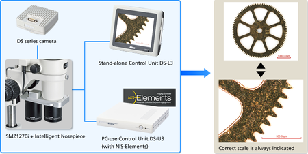 结合DS-L3相机控制器和NIS-Elements图像软件,SMZ1270i可以检测变倍信息。同时,配合智能型P-RNI2物镜转盘配件可以检测当前使用的物镜。变倍信息结合物镜信息,系统可自动改变图像标尺大小,当您在改变倍率时图像中的标尺与测量信息将会自动对应。